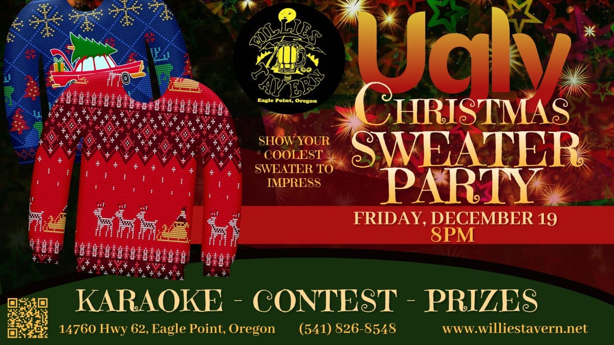 Cheers to ugly sweaters and great times! It's time again for Willie's Tavern Ugly Sweater Party. Put on your ugliest, coolest, most festive sweaters and join us for an epic night of fun! Karaoke with Smiles Entertainment at 8pm. Ugly Sweater contest, games and prizes! You will not want to miss this party!