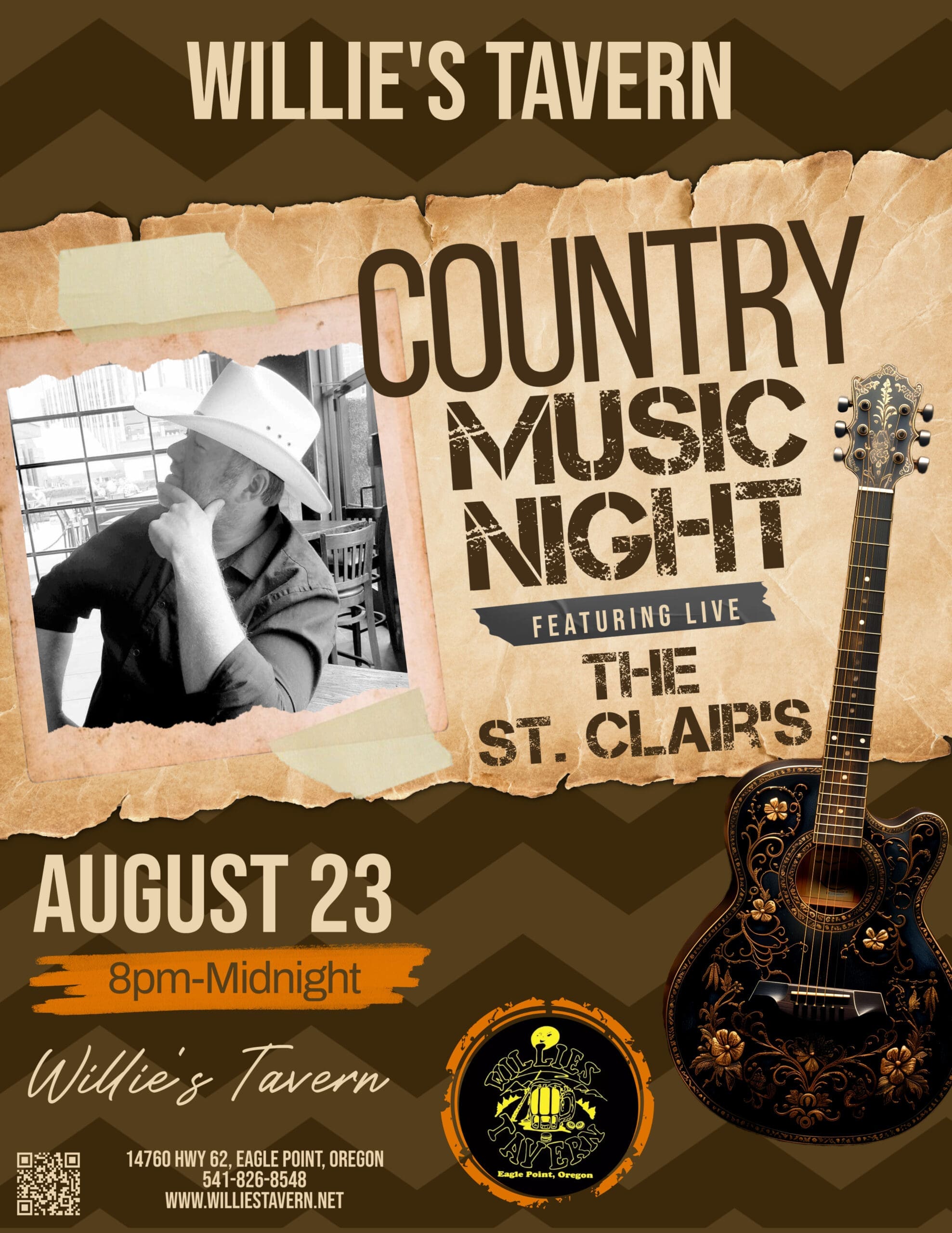 Join us September 27th for Willie's Tavern Hoe Down. Live music with the St. Clair's. BBQ Dinner special.